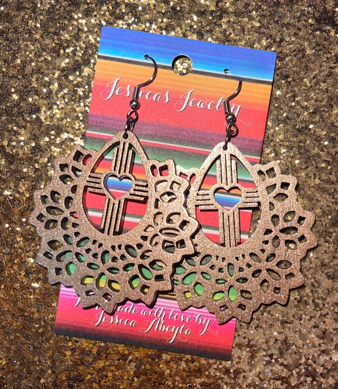 Very lightweight wooden Zia earrings with stainless steel hooks.